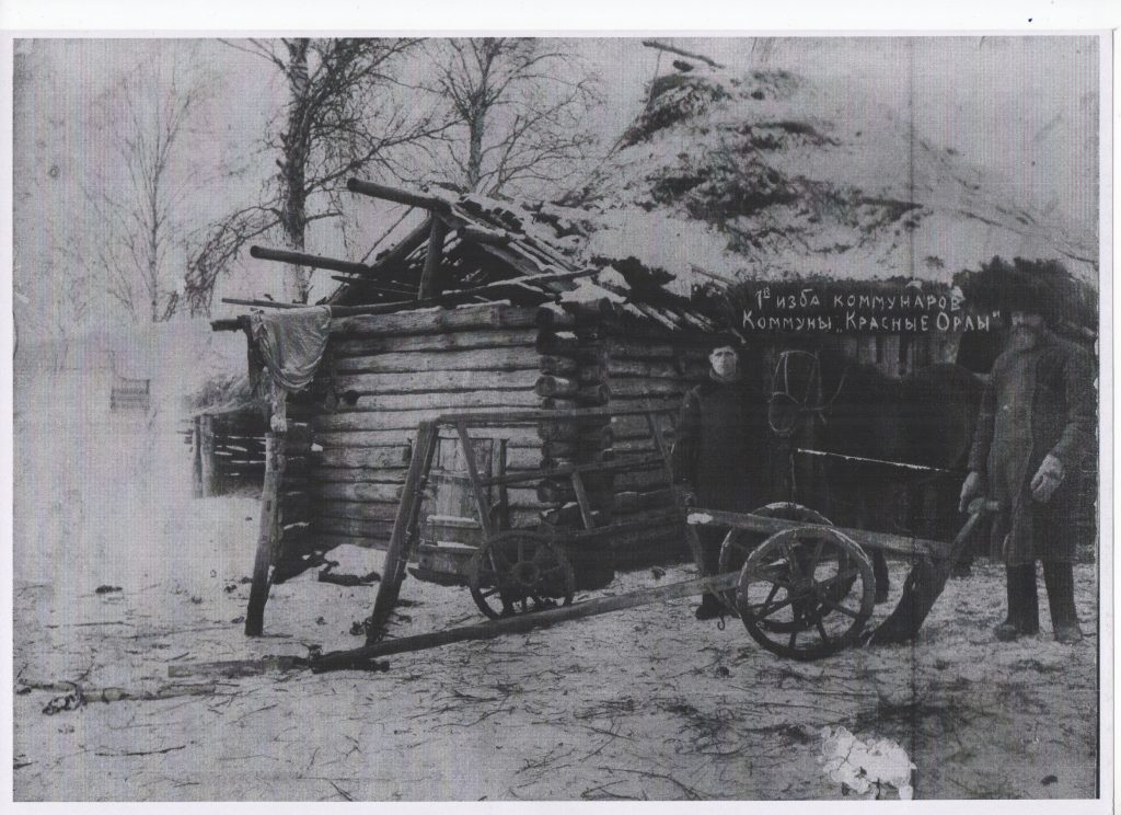Очень неказистым было первое пристанище коммунаров на новой земле: бревнышки тонкие, так как доброго леса на участке не оказалось, а покупать не на что. Крышу, сколько смогли, покрыли соломой, остальное- чем придется. Кирпича на трубу не хватило, поэтому печь топилась по-черному, дым выходил через проем в стене. Пол -мерзлая земля, у стены нары в два яруса, чтоб народу побольше вошло. Здесь коммунарам жить уже весной. Ехали домой, оборачивались. Тихое замерзшее Травяное и безжизненные заснеженные поля вокруг уже стали чем-то родным. Сегодня, впервые не только в истории Спасского, но и всего Сухоложского района на общественный труд вышла первая коммуна. Поэтому решили единогласно: 27 февраля считать днем создания коммуны «Красные Орлы» и праздновать его ежегодно[6].Началась весна. Посевная. День год кормит. Коммунары решили посеять этой весной больше, чем сеяли все, будучи единоличниками. Собрали все зерно, которое могли достать. Сделали кузню. Отремонтировали сохи и сабаны**. Поселились на всю весну в избушке на Истоке, спали на нарах вповалку. На удивление единоличным крестьянам Спасской и Заимки отсеялись рано. А вот «справным хозяевам» без батраков трудновато пришлось. Раньше же было как: в самое доброе время отбатрачит бедняк у богатого соседа, а потом, когда земля уже высохнет, дает тот свою лошадь, как плату за работу. Коммунары на своих полудохлых лошадях испытывали определенное чувство гордости!! … «То ли еще будет, когда мы в силу войдем!!!». Но надеждам коммунаров не суждено было сбыться. 1921 год. Засуха началась с ранней весны, за всё лето не выпало ни капли дождя. Несмотря на организованный полив с озера, не уродились ни картофель, ни горох: вода тут же пропадала в трещинах пересохшей земли. В августе вручную убирали каждый колосок. Запасов зерна не было, все ушло на посевную, а нового урожая, прикинули, хватит на неделю. В лесу ни ягод, ни грибов. Что делать!? Решили запасать корьё***, лебеду. Начался самый страшный голод за все последние годы.