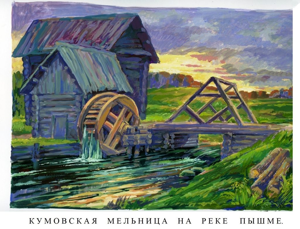 Но всё-таки нам повезло, одна фотография попала в наши руки. На ней изображены останки плотины и мельничных сооружений наверно самой известной мельницы нашего района – Кумовской. Эта мельница проработала дольше всех остальных. Фотографию мы естественно увеличили, слегка подреставрировали и по нашей просьбе асбестовский художник П.А.Попов нарисовал картину.