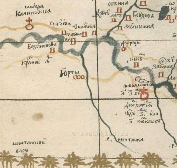 Севернее Шеитанки показан Шеитанский бор. Это тоже любопытная подробность, показанная на чертеже С.Ремезова.