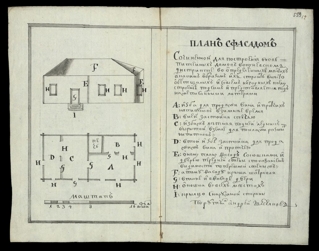 [21] План с фасадом стандартного питейного дома для Окуневского дистрикта РГАДА Фонд: 613 Опись: 1 Дело: 493 Лист: 558 об.-559