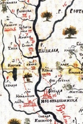 В «Хорографической книге» указывались некоторые подробности местоположения слобод. Так и с Новопышминской. На старо-славянском указано, что «ходу 7 верст». Подразумевается, что это расстояние до лежащей ниже по реке слободы – Калиновской. Версты были 1000 саженными, т.е. ок. 2 км. Значит «7 верст» это ок.14 км. Так, примерно, и есть.