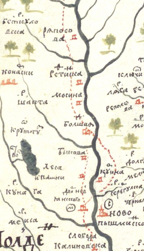 К сожалению, река Брусянка в «Чертежной книге Сибири» не показана. Но деревни Мосина и Большая расположены на чертеже между устьями рек Шата и Рефт. Расстояние – 8 км. 300 лет назад там было только три поселения: д. Брусянская, Знаменский погост и д. Рогалева. Предполагаем, что тобольские картографы назвали Мосиной деревню на левом берегу р. Брусянки (д. Брусянку), а Большой – поселение правее русла Брусянки (будущий Знаменский погост и с. Знаменское).