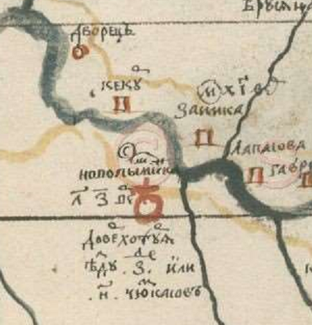 Об этих поселениях говорилось выше. Можно добавить, что деревня Большая на чертеже обозначена не одним простым квадратиком, но и значком, который (видимо) отображает недостроенную церковь. Это еще одно доказательство идентичности деревни Большой и деревни Брусянской (в будущем – Знаменского погоста).