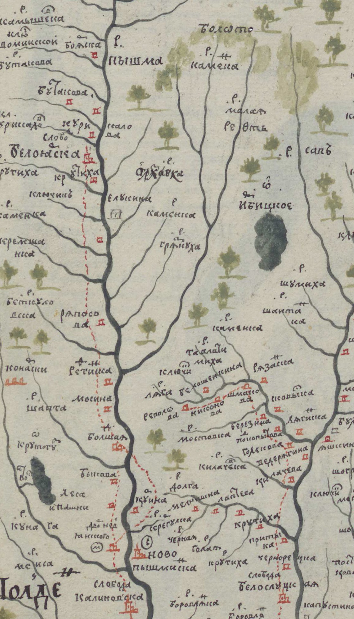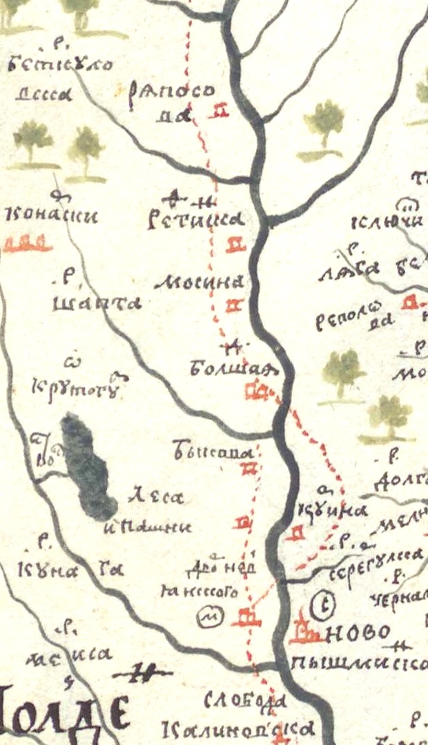 Выше по реке повторение ситуации, показанной в «Чертежной книге»: деревни Болшая (Большая), Мосина, Рефтинска («ф» через «фиту»), Ряпасово.