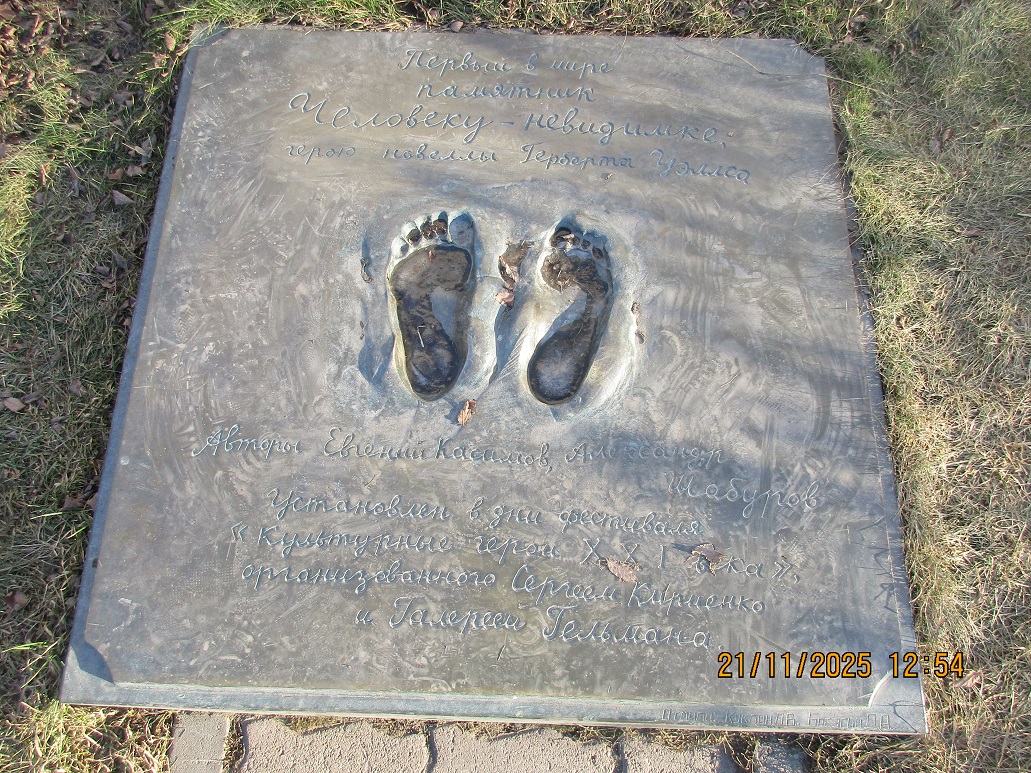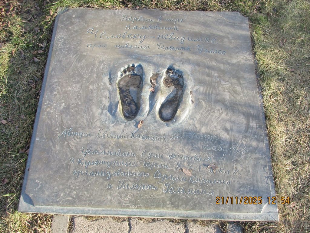 Перед зданием библиотеки на газоне плита. Обычно во второй половине ноября снег, а в этот год газоны имеют почти сентябрьский вид и плиту-памятник Человеку-невидимке видно хорошо. Это память о временах почти былинных.